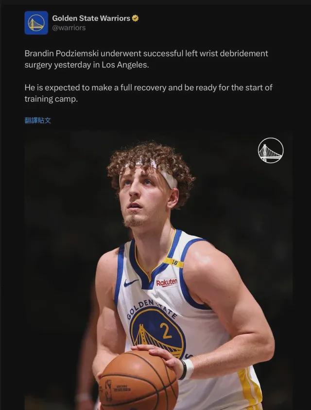 勇士官推:“波杰姆斯基近日接受了左手腕清创手术,预计将完全恢复,并为新赛季训练营做好准备。”