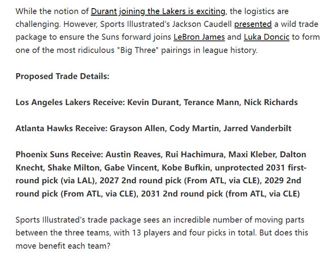 北京时间5月29日晚,美国媒体FW建议三方大交易——亚特兰大老鹰、洛杉矶湖人队、菲尼克斯太阳,这笔交易太阳获得7个球员+4个选秀权,湖人则得到杜兰特、理查兹、曼恩三个球员,湖人一下就成为超级强队了,太阳则重新围绕布克建队。