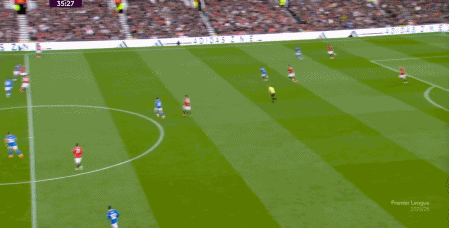 所以在这短短的几分钟里,你就可以看到曼联在攻防两端的效率问题了,但在这一点之外,也应该预判到点位上如果布置了不同的球员,这些攻防表现可能会发生什么样的变化,也可以看到阿莫林的343体系在利用什么空间和优势,具体在打什么东西。