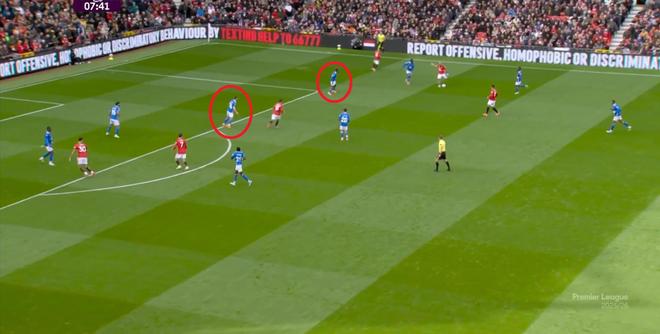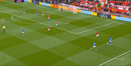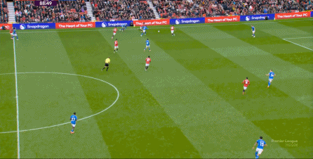 比如这个右路的4防3,达洛特和卢克-肖两人扑一点,布鲁诺和芒特都没有注意到身后空间: